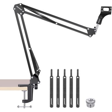 Die Halterung kann Mikrofone mit einem Durchmesser von bis zu 33 mm und einem Gewicht von bis zu 1,5 kg aufnehmen. Der Mikrofonarm besteht aus zwei Armen mit einer Länge von jeweils 35 cm. Dank der starken Federn in den Armen ist das Einstellen und Halten präziser Positionen sehr einfach. Der obere Arm endet in einem Bolzen mit 3/8"-Gewinde.