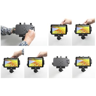 Die Halterung ist sehr stabil, das Tablet bleibt nicht darin hängen und vibriert nicht. Die Halterung wird am Brodit ProClip oder an Brodit-Montagesockeln und -Armen befestigt.