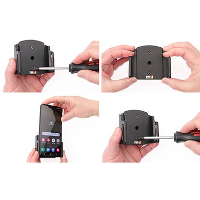 Die Halterung ist sehr stark, das Telefon klopft oder vibriert nicht darin. Die Halterung verfügt über ein Scharnier, dank dem das Telefon jederzeit problemlos horizontal oder vertikal gedreht oder gekippt werden kann. Der Halter wird am Brodit ProClip befestigt.