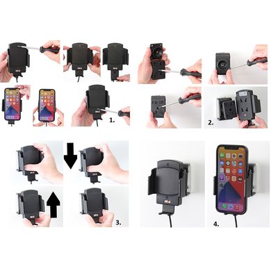 Die Halterung ist sehr stark, das Telefon klopft oder vibriert nicht darin. Die Halterung verfügt über ein Scharnier, dank dem das Telefon jederzeit problemlos horizontal oder vertikal gedreht oder gekippt werden kann. Der Halter wird am Brodit ProClip befestigt.