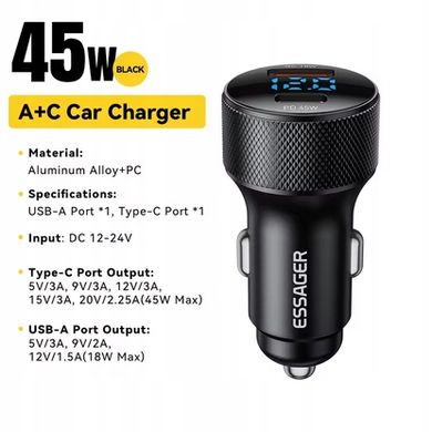 Essager 45W Autoladegerät mit PD3.0+QC3.0, Digitalanzeige, 2 USB-A/USB-C Anschlüsse, 1m Kabel, Überspannungsschutz, 12–24V Eingang, schwarz.
