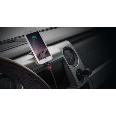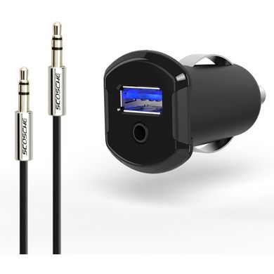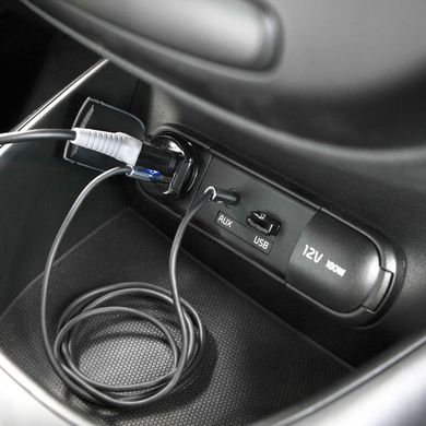 Hochwertiges Autoladegerät für mobile Geräte mit AUX-In-Eingang für die Musikwiedergabe per 3,5-mm-Kabel direkt an die Autolautsprecher.