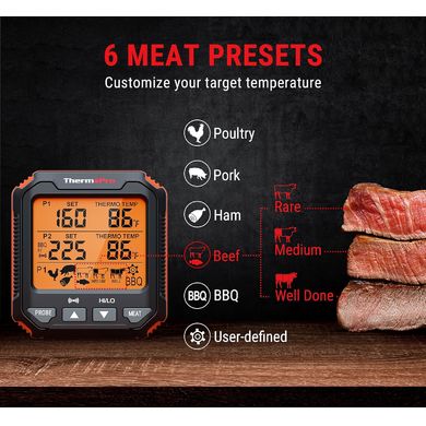 Das Grill- und Küchenthermometer mit 2 Edelstahlsonden ist für alle Lebensmittel und Flüssigkeiten geeignet. Es gibt6 voreingestellte Fleischtemperaturen und 3 Bräunungsstufen, mit denen Sie die Temperatur Ihrer Speisen nach Ihren Wünschen anpassen können. Legen Sie eine Zieltemperatur fest, und dieses digitale Speisenthermometer erinnert Sie daran, zum richtigen Zeitpunkt mehr Brennstoff in Ihren Smoker oder Ofen zu geben. Das Thermometer ist bis auf ±1 °C genau und macht Sie innerhalb von Sekunden auf die kleinste Temperaturänderung aufmerksam. Mit einem weiten Temperaturbereich von 0°C bis +300°C ist es für alle Herde und Kochsituationen geeignet. Das Thermometer ist mit einer benutzerfreundlichen Schnittstelle ausgestattet und lässt sich leicht einrichten und bedienen. Es gibt mehrere Möglichkeiten, das Thermometer zu positionieren, z. B. mit einemrückseitigen Magneten, einem Tischständer und einem Hakenloch.