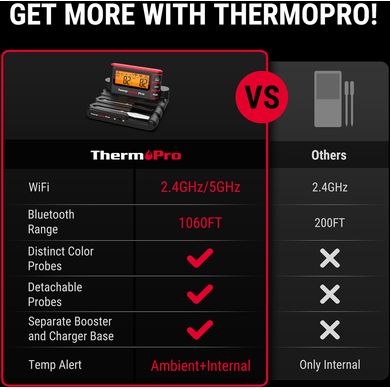 Ein digitaler Temperatursensor für das Innere des Fleisches und ein NTC-Sensor für die Umgebungstemperatur sorgen für genaue Messungen mit einer Toleranz von ±0,5 °C für die Innentemperatur und ±1,8 °C von –23 °C bis 100 °C (ansonsten ±2 %) für die Umgebungstemperatur. Wenn Sie Ihr Smartphone nicht benutzen, werden Sie das abnehmbare Display zu schätzen wissen, das eine unabhängige Steuerung und Multitasking ermöglicht. Die übersichtliche Oberfläche bietet Ihnen alle Informationen auf einen Blick, ohne dass Sie sich auf die App auf Ihrem Smartphone verlassen müssen. Die abnehmbaren Ladehüllen dienen nicht nur als praktische Verpackung für die Messfühler, sondern auch als Powerbank, damit Ihr Thermometer immer einsatzbereit ist. Mit einer Akkulaufzeit von bis zu 3 Monaten im Verstärker und 36 Stunden in den Fühlern bei einer vollen Ladung über USB-C müssen Sie sich auch bei den längsten Grillmarathons keine Sorgen machen, dass Ihnen der Saft ausgeht. Die ThermoPro-App ist Ihr intelligenter Assistent in der Küche. Sie führt alle notwendigen Berechnungen für Sie durch, überwacht die Garzeiten, weist Sie auf wichtige Momente hin und liefert detaillierte Schritt-für-Schritt-Anleitungen.