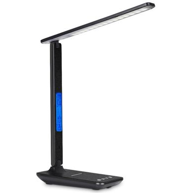 LED-Tischlampe, 3 Lichttemperaturen. 5 Lichtstärken, 10W kabelloses Ladegerät, USB-Ladeausgang, Uhr, Wecker, Kalender, Thermometer.