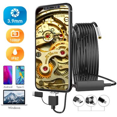 Endoskop mit 5 m Festkabel, für USB-A, micro USB und USB-C Stecker, geeignet für Android, PC mit WIN und MacBook