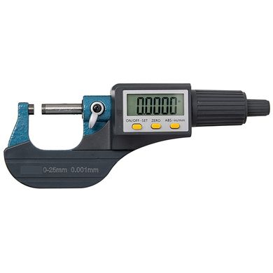 Digitale Bügelmessschraube mit drei Tasten, mm/in-Umrechnung, Genauigkeit: ±0,003 mm, Auflösung: 0,001 mm, verpackt im Kunststoff-Schutzkoffer, Batterie CR2032
