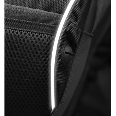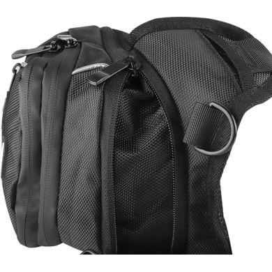 Die Rückseite der Tasche ist aus atmungsaktivem und komfortablem Material mit einem Belüftungsgitter gefertigt. Außerdem gibt es auf der Rückseite drei Schlitze für den Oberschenkelgurt. Mit diesen Ösen können Sie die ideale Position des Oberschenkelriemenseinstellen.
