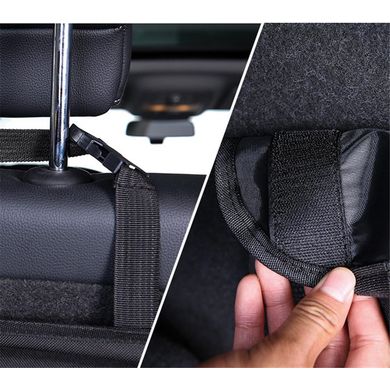 Zwei Klettverschlüsse auf der Rückseite des Organizers erleichtern den Zusammenbau. Mit diesen Reißverschlüssen lässt sich der Organizer leicht am Sitz befestigen und dann sichern. Zur Sicherung des Organizers gibt es 3 Schnallenbänder, die oben aus dem Organizer herauskommen und zum Einrasten an den Sitzkopfstützen dienen. Die 2 Klettverschlüsse helfen Ihnen außerdem, die Sitzlehnen präzise zu befestigen. Der Organizer ist aus strapazierfähigem Oxford-Gewebe gefertigt, das nicht nur mechanischen Beschädigungen gut widersteht, sondern auch wasserdicht ist.