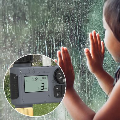 Das Gerät bietet die Möglichkeit, die Bewässerung manuell zu starten, ohne das gespeicherte Programm zu ändern, eine Funktion zur Bewässerungsverzögerung bei Regenwetter von 1 bis 7 Tagen sowie eine Kindersicherung gegen unbeabsichtigtes Zurücksetzen. Eine Batteriestandsanzeige informiert Sie rechtzeitig über einen notwendigen Batteriewechsel. Der integrierte Filter am Wassereinlass schützt das Ventil vor Verschmutzungen und verlängert die Lebensdauer des Geräts.